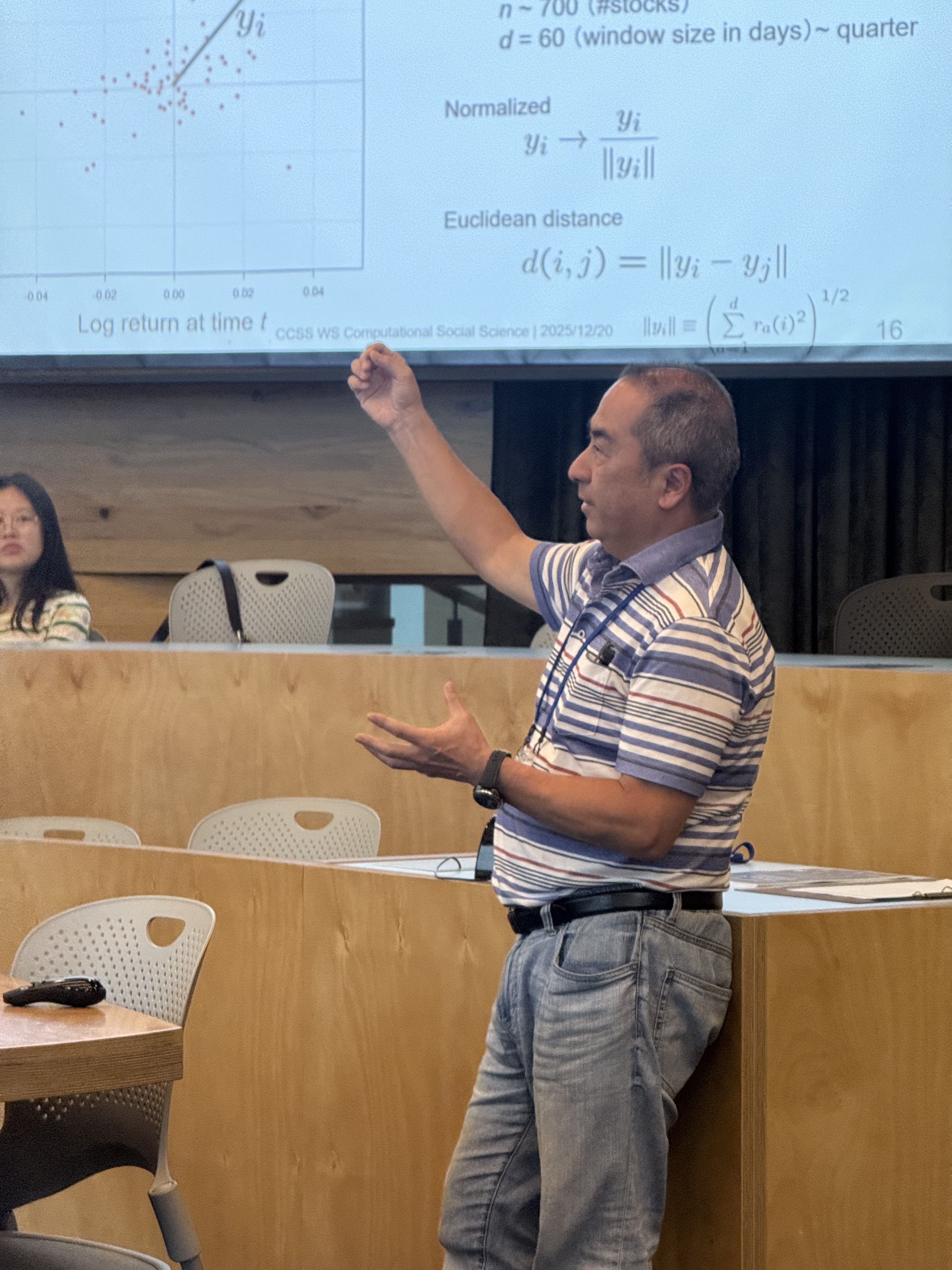 From the Research Institute for Economics and Business Administration at Kobe University, Prof. Kondo presented "Assessing the Impact of Human Mobility on Retail Performance during the COVID-19 Outbreak in Japan," and from CCSS, Prof. Matsui presented "Global Patterns of Knowledge: Language, Genre, and the Geography of Knowledge." Throughout the workshop, discussions frequently centered on practical and technical issues, including how empirical and simulation results were validated, how to interpret complex quantitative measures, and how to scale computations while maintaining transparency and reproducibility, leading to lively Q&A sessions and a highly productive workshop atmosphere.